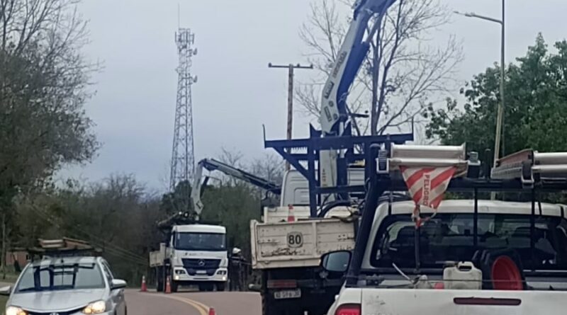 Personal de la ECSAPEM se encuentra realizando el izado de las tres columnas que cayeron ayer a la tarde sobre la calzada, provocando la interrupción del tránsito. En un primer momento, para habilitar el paso de vehículos, las columnas fueron depositadas a un costado del camino.
