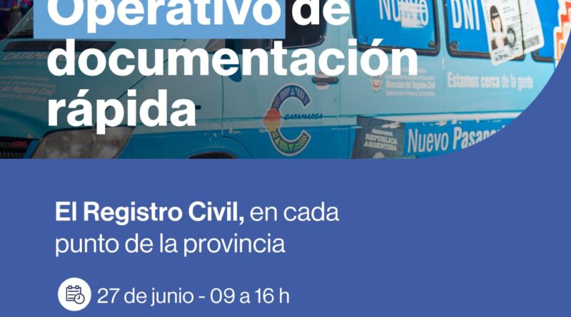 Este jueves 27 de junio se realizará el “Operativo de documentación Rápida”, en la localidad y en el horario de atención al público será de 9 a 16 horas.