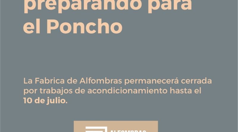 La Dirección Provincial de Artesanías del Ministerio de Cultura, Turismo y Deporte de la provincia comunica que desde hoy viernes 28 de junio la Fábrica de Alfombras permanecerá cerrada por trabajos de acondicionamiento para la Fiesta Nacional e Internacional del Poncho que se realizará del 12 al 21 de julio en el Predio Ferial.