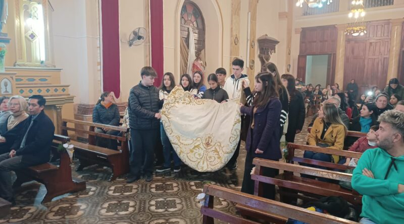 Las distintas piezas que conforman la vestimenta de fiesta de la Imagen fueron presentadas por distintos miembros de la comunidad educativa: alumnos, docentes, personal jubilado y familias.