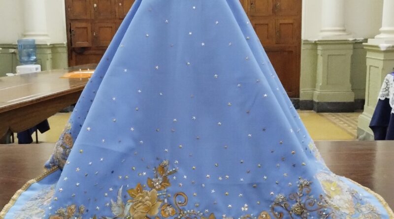 Tanto el vestido como el manto fueron realizados en el Taller de María con el aporte generoso de muchas personas, tanto en la realización como en la donación de materiales.