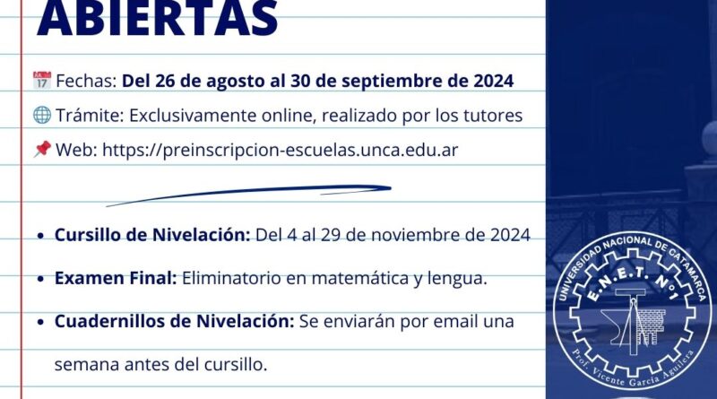 La Escuela Preuniversitaria ENET N°1 informa a todos los interesados que el período de preinscripción estará abierto desde el 26 de agosto hasta el 30 de septiembre de 2024. El trámite de preinscripción deberá ser realizado exclusivamente por los tutores de los estudiantes a través del sitio web: https://preinscripcion-escuelas.unca.edu.ar.